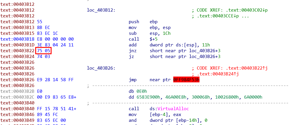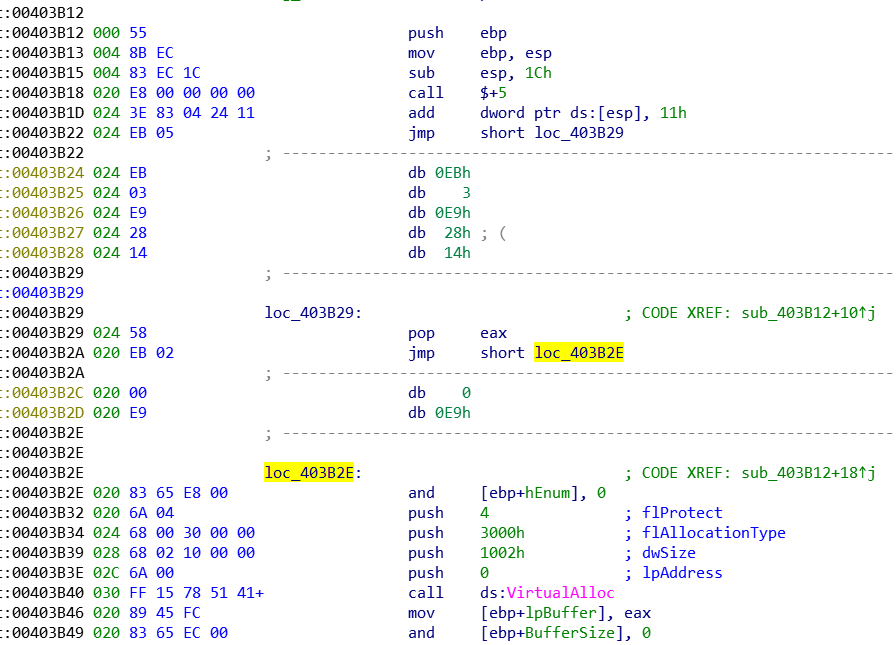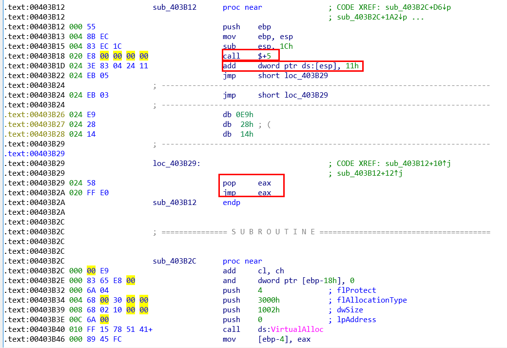먼저 0x403b18에서 call $+5로 0x403b1d를 호출하는데, 이때 call instruction은 ret 주소(0x403b1d)를 스택에 push하므로 esp에는 0x403b1d 값이 존재하게 되는데 0x403b1d에서 [esp]에 0x11값을 더하므로, esp에는 0x403b2e값이 들어가게 된다. 다음으로 0x403b29에서 pop eax, jmp eax명령어를 통해 esp의 0x403b2e로 점프하게 된다.