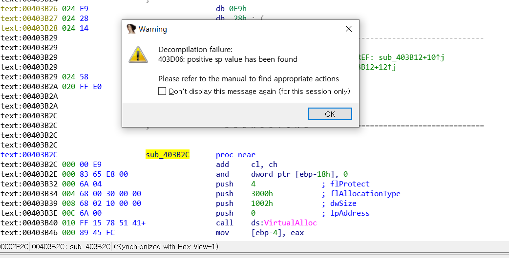 더불어 sub_403b2c 는 함수 프롤로그가 없어서 스택프레임이 적절히 생성되지 않아 디컴파일 시 아래의 오류가 발생하며 디컴파일이 실패한다.